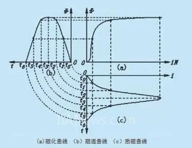 图3(a)是电动机磁路的磁化曲线;图3(b)是磁通的波形,由于磁路饱和的原因,磁通波形的上面被“削平”了,变成了平顶波;图3(c)是励磁电流的波形,其横坐标是励磁电流i0,与磁化曲线图3(a)的横坐标对应。纵坐标是时间t,它和磁通曲线的横坐标相对应。因此,它是由图3(a)和图3(b)综合作出的。由图3可以看出,励磁电流i0的波形将发生严重畸变,是一个峰值很高的尖峰波。磁路越饱和,励磁电流的畸变越严重,峰值也越大。由于尖峰波的电流变化率di/dt很大,但电流的有效值不一定很大。结果是:往往在负载很轻时发生过电流跳闸。这种由电动机磁路饱和引起的过电流跳闸,主要发生在低频、轻载的情况下。常见的例子如: