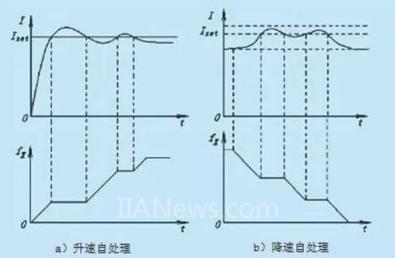 2)准确预置升(降)速自处理(防失速)功能变频器对于升、降速过程中的过电流,设置了自处理(防失速)功能。当升(降)电流超过预置的上限电流iset时,将暂停升(降)速,待电流降至设定值iset以下时,再继续升(降)速,如图4所示。