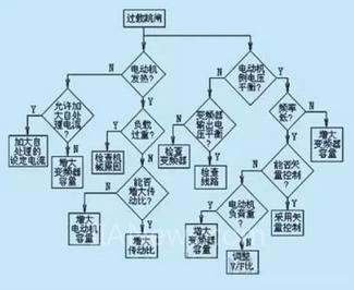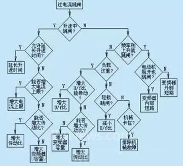 3)其他措施如果采用了自处理功能后,因延长了升、降速时间而不能满足生产机械的要求,则:a)考虑适当加大传动比,以减小拖动系统的飞轮力矩,使电动机容易启动及升速;b)如果不能加大传动比,则只能考虑加大变频器的容量了。综上所述,过电流跳闸的判断流程如图5 所示。