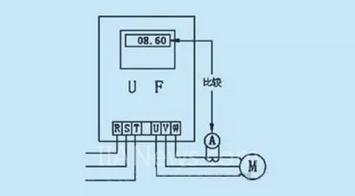 3) 检查是否误动作在经过以上检查,均未找到原因时,应检查是不是误动作。如图6所示,判断的方法是在轻载或空载的情况下,用电流表测量变频器的输出电流,与显示屏上显示的运行电流值进行比较,如果显示屏显示的电流读数比实际测量的电流大得较多,则说明变频器内部的电流测量部分误差较大,“过载”跳闸有可能是误动作。