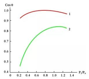 图2永磁同步电动机与异步电动机的功率因数曲线比较
