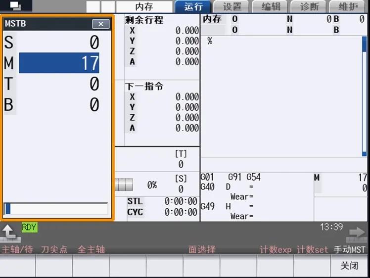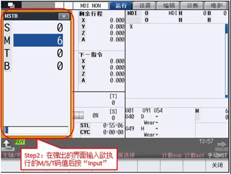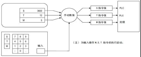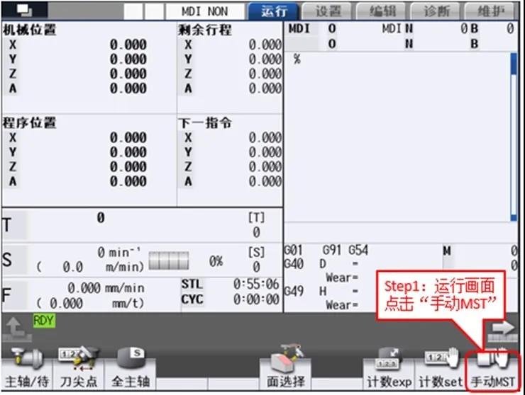 “手动MST”又名“手动数值指令”,该功能通过简单的操作,即可实现主轴的转速变更、启动、停止及指定刀具的调用选择和主轴刀具更换等动作。