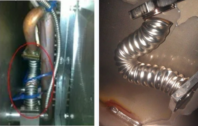 上图中的银色波纹管内冷却水结冰后体积膨胀,导致波纹管弯曲破裂。