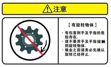 在机器运行中,因检查作业需要接近机器时,请盖住旋转部。否则可能会被卷入旋转部,导致重大的人身事故。