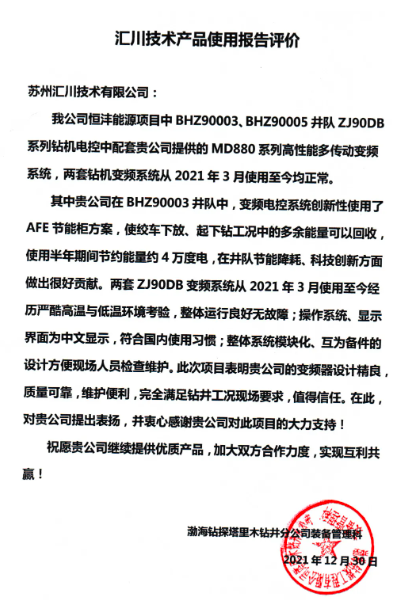 日前,汇川技术收到中国石油渤海钻探塔里木钻井分公司产品使用报告评价,“设计精良、质量可靠、维护便利……”,客户对汇川MD880的优异表现赞不绝口。