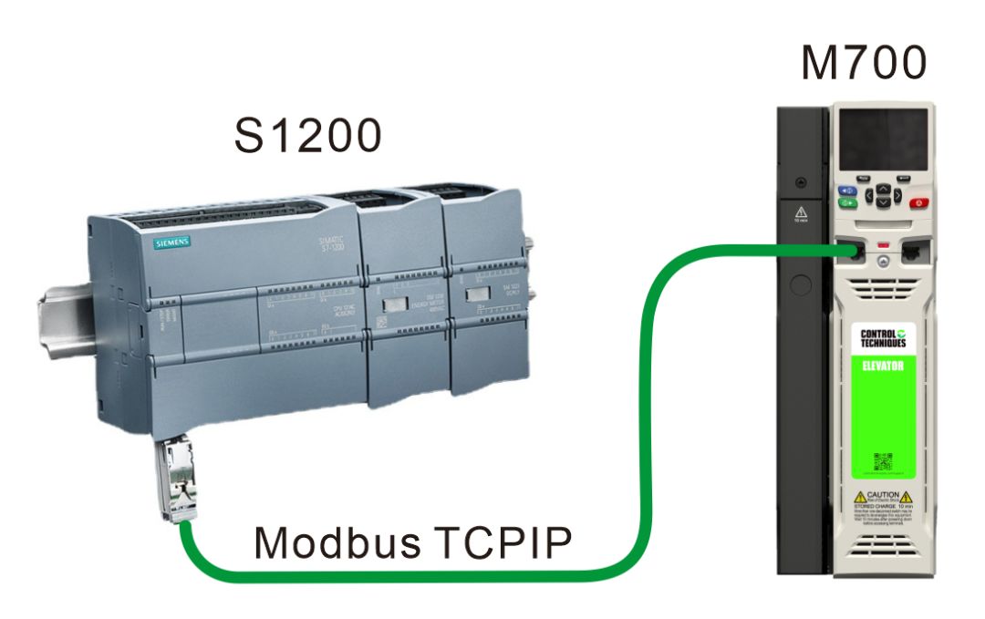S1200是一款紧凑型、模块化的PLC,可完成简单逻辑控制、高级逻辑控制、HMI 和网络通信等任务的控制器。S1200与尼得科CT Unidrive M700驱动器板载以太网模块Modbus TCPIP 通讯硬件连接如下图所示: