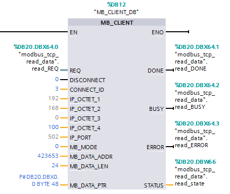 Modbus TCP Client通讯指令(如下图所示):包含输入参数和输出状态参数,具体解释如下: