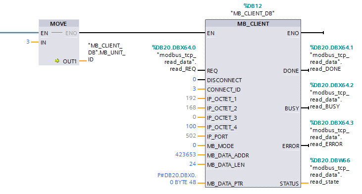 注意:上图所示修改ID所用MOVE指令输出地址位于MB_CLIENT背景数据块中。该参数默认设置为255(0XFF)。