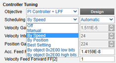 位置/速度环中最多有 63 个控制器。您可以使用特定的控制器,也可以让增益调度机制根据所选方法自动选择控制器。