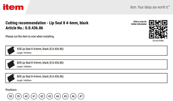 说到节省时间,单边密封胶条就是一个很好的例子。item Engineeringtool 会自动选择与面板尺寸匹配的单边密封胶条,单边密封胶条要能将面板牢牢地卡在槽轨中。此时,item Engineeringtool 也能帮您做出决定。一直以来,我们在开发这款在线工具时都融入了我们在产品开发方面数十年的丰富经验——正是凭借对 item 产品的了解,这款工具才能帮您做出最好的选择。我们既提供切割好的单边密封胶条,也有 20 米长的一整卷,您可以自行选择。“单边密封胶条由塑料制成,这种材料在使用过程中会拉伸,因此您要预留出多余的长度。item Engineeringtool 不仅考虑到了这一点,还兼顾可能出现的浪费”。Thiel 解释说。
