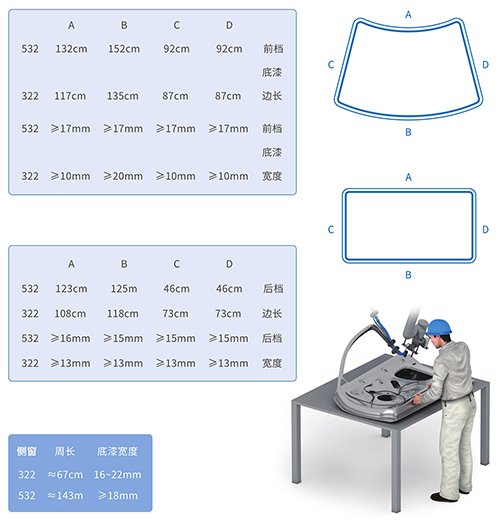 发动机缸体涂胶、前后挡风玻璃涂胶、三角窗涂胶等
