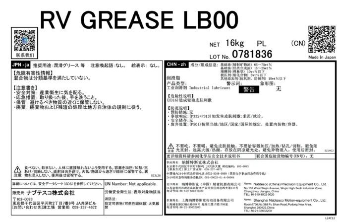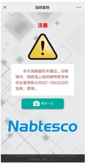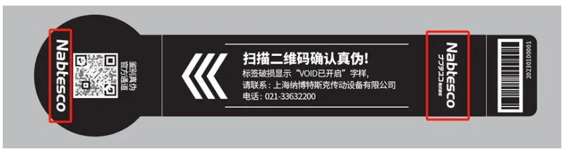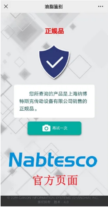 提示:如采购时遇到标签上未标有“Nabtesco”LOGO,或者使用微信“扫一扫”功能扫描二维码后未进入官方公众号(上海纳博特斯克传动设备有限公司),而是进入其他鉴别页面的,则该张标签及润滑剂有被仿冒造假的风险。请勿开封使用,立即联系我司。
