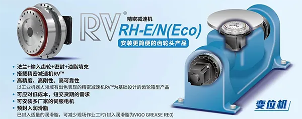 RH-E/N(Eco)系列秉承了已累计生产1000万台的精密减速机RV™产品所具有的高精度、高刚性、高可靠性等卓越特点。在此基础上,产品在出厂时就已配备了法兰+输入齿轮+适量润滑脂及油脂密封件。使得用户能够省去设备设计时的麻烦;更加简便、快速地把减速机安装到制造设备上,有效缩短了设计和安装工时。在生产过程中,持续保持设备的稳定性,减少不良品的发生,使产品质量、产量和效率都更上一级台阶。