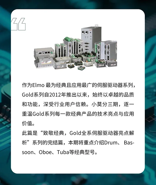 此篇是“致敬经典,Gold全系伺服驱动器亮点解析”系列的完结篇,本期将重点介绍Drum、 Bassoon、Oboe、Tuba等经典型号。