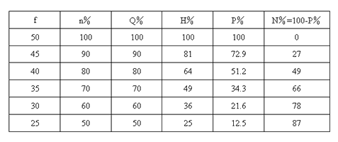 ![]() 当风机转速下降时,电动机的功率迅速降低,例风量下降到80%,转速亦下降到80%时,则轴功率下降到额定的51%,若风量下降到50%,轴功率将下降到额定的13%,其节电潜力非常大,并有下述曲线、阴影部分表示采用变频器调速方式的节电效果,其节电可达30-40%效果十分明显。对不同使用频率时的节电率N%可查表: