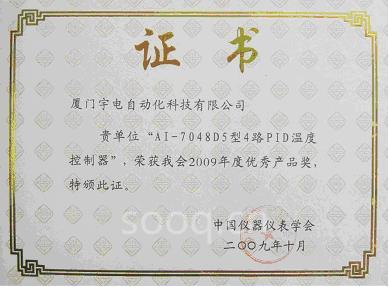 经国家科学技术部批准,国家科技奖励办公室授权,中国仪器仪表学会设立了科学技术奖,每年评奖一次。宇电新推出的AI-7048D5型四路PID,是国内首个导轨安装型多路高精度温度控制器,与主要进口同类产品相比,其宽度仅为进口产品的1/2,精度更高,功能更强,且每通道价格比进口仪表便宜60%,产品具备国际领先水平,使其在本次评比中,深受评委们的一致认可,从而被评为2009年度优秀产品奖。本次评奖活动是面向全国仪器仪表领域,是目前国内仪器仪表学科和产业领域中公认的权威奖项。