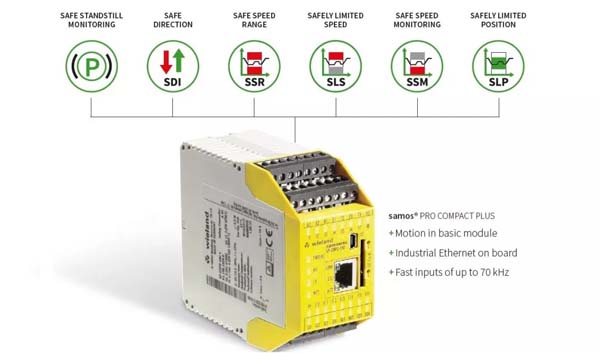 威琅电气samos®系列再添一款具有里程碑意义的产品——samos®PRO Compact PLUS。这款产品可以在基本模块中实现安全速度、安全方向、安全位置的监控。