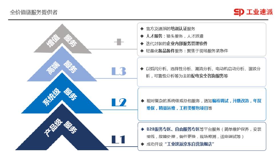 工业速派成立于2016年4月,是全国工业领域知名的智能服务平台,旨在利用“工业+互联网”全新的思维模式,为产品厂商、OEM设备制造商、系统集成商及最终用户解决长期困扰的存量市场的服务难题。通过有效整合全国的工业服务资源,工业速派建立了覆盖全国范围的核心服务商、城市合伙人、签约服务站三级服务网络,并凭借B2B服务专区、自由服务专区、培训专区和备件专区四大模块为客户提供安全、专业、高效的品质服务,突破了传统工业服务“少、慢、乱、贵”的市场局限,打造了“多、快、好、省”的全新业务模式。