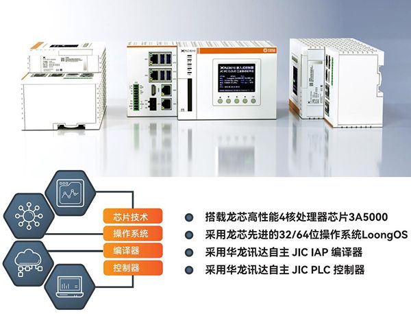 2018年,华龙讯达与龙芯中科深度合作,开展国产中大型高性能可编程逻辑控制器(PLC)的研发攻关。龙芯中科提供中央处理器(CPU)、图形处理器(GPU)、内存控制器、晶振、片内高速接口模块(PHY)等上百种自主开发IP核,华龙讯达依托多年高端装备配套实践与第一代工业自动化控制系统技术积累。