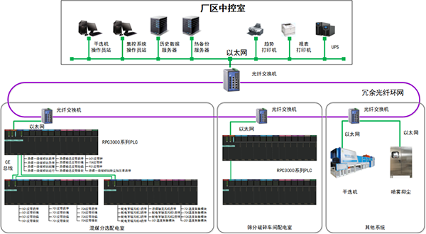 该项目为生产集控系统,对PLC控制的精准性和可靠性提出极高要求,通过RPC3000系列PLC实现了混煤分选系统控制,并与产品储运系统联动。在原煤破碎站动态负载场景中,RPC3000以极高的系统响应速度实现破碎机转矩的平稳调节,降低设备磨损率。在干法分选环节则通过高精度采集实时校准分选密度,结合PID算法精准调控气流量提高精煤回收率。针对转载点煤流堆积风险,PLC与拉绳、跑偏及失速保护装置联动触发紧急停机指令,缩短平均响应时间,有效保障栈桥运输安全。此外,系统与原有国外品牌PLC混合组网,无缝对接原煤卸料点、矸石卸料点控制逻辑,大大压缩项目执行周期。