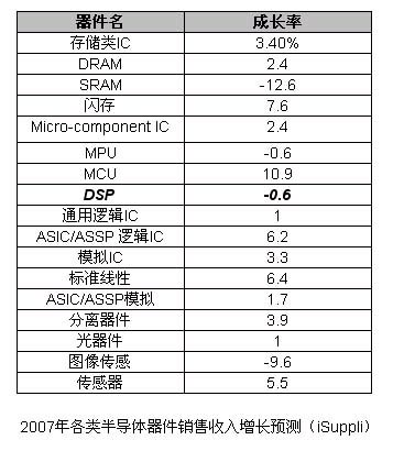 日前,调研公司iSuppli发布的一项预测中指出,今年全球的DSP销售收入将会首次出现负增长,即2007年全球DSP的销售收入增长为-0.6%,而就在2006年全球DSP的增长还是12.3%,在各类半导体器件中属于增长率较高的领域。为什么会出现如此大的倒退呢?iSuppli副总裁DaleFord对《国际电子商情》记者解释:“我们预测2007年DSP销售收入出现下降的主要原因有两个:一个是由于在手机市场,TI的收入下降、ADI的退出导致以DSP架构为主的基带芯片收入降低,而以ASIC/ASSP逻辑IC架构形式的基带芯片收入上升,比如联发科、高通和英飞凌的基带均属于这一类;第二个是DSP的平均价格不断下降,所以也导致收入下降。当然,从发货量来看,并没有下降。”