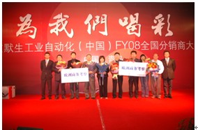 经过艾默生公司市场人员和全国各工控产品分销商的不懈努力和积极开拓,艾默生工控产品的销售在FY07取得了骄人的业绩,并在一些新的重点行业和新客户处取得突破,客户的认知和认可度得到进一步提升,新产品推广会,行业展示会,技术交流会蓬勃展开,建立起了一定的品牌地位。在激烈的市场竞争中,涌现出了一批批优秀的分销商和个人,在答谢晚宴上,艾默生对这些人员进行了表彰和嘉奖,评选出年度优秀分销商,颁发了市场拓展奖以及维护奖,起到了良好的激励作用。