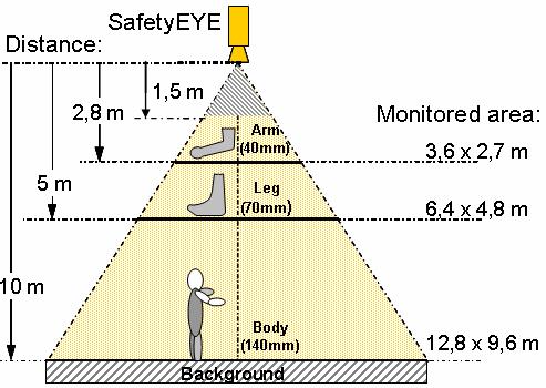 SafetyEYE是世界上第一台安全照相系统,采用其安装在被监控区域的上方,能够对下方的区域进行三维立体的监控,其最大的安装高度为10m,监控面积为120m2,安全等级达到SIL2。