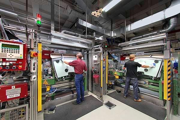 那么SafetyEYE最适合应用在哪些场合?通常SafetyEYE适合在那些往往过去需要几套安全光幕或者安全扫描仪(Scanner)才能达到安全相关要求的场合。如下图,这是一个汽车挡风玻璃涂胶工位。由物流线将待涂胶的挡风玻璃运输到涂胶的两个工位,待运输皮带停止运动之后,现场工作人员进入工作区域进行涂胶。在这样一个工作区域上,如果采用我们传统的安全光幕和扫描仪来作为安全保护设备,那么怎么使用呢?每个工位我们需要使用1套安全光幕和1个安全扫描仪来进行区域保护,两个工位一共需要2套安全光幕和2个安全扫描仪来完成。大家可以在下图中发现安装传统的安全光幕和安全扫描仪前需要额外的规划安装位置并且需要大量的时间用来安装调整安全光幕以及调试安全扫描仪。在生产过程中,由于现场工作人员会频繁的走动,所以安装在现场的安全光幕和安全扫描仪极有可能被现场工作人员撞到。如果安全光幕被撞离了正确位置,那么生产线必定会由于安全光幕被触发而停止。这样的话又需要重新开始调整安全光幕,势必会影响整个工厂的生产效率。