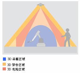 警告区域—当操作人员触碰到该区域时,SafetyEYE会触发安全控制器使得机器以慢速运行,这样可以减少机器对操作人员危险的同时还可以提醒操作人员他已经进入警告区域了。