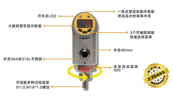 传感器的用户体验经过精心设计,旨在提供最大的便利性和安全性。它的按键锁功能可以有效预防误操作,而无操作自动退出的设计则提高了设备的安全性。此外,传感器支持灵活设置模拟量的起始值和终点值,还有多种模式可供选择,包括常开、常闭、NPN、PNP、磁滞模式和窗口模式,使其能够满足不同用户的需求。