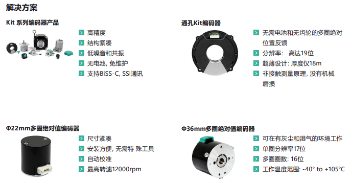 22mm外径KIT编码器融合传感技术的独特设计具有不间断、无电池的多圈功能,每一圈都由韦根脉冲供电。无齿轮、紧凑和经济优化的概念是整合到伺服、步进或BLDC电机的理想选择。22mm和36mm外径编码器安装过程中不需要特殊设备,且自动校准。有各种各样的机械配置从22毫米外径开始。 增强的信号处理软件使高分辨率的位置测量具有出色的延迟补偿。