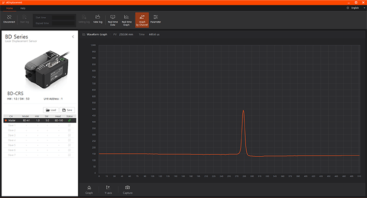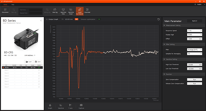 激光位移传感器的最大分辨率1㎛(BD-030),用于稳定和精确的测量。