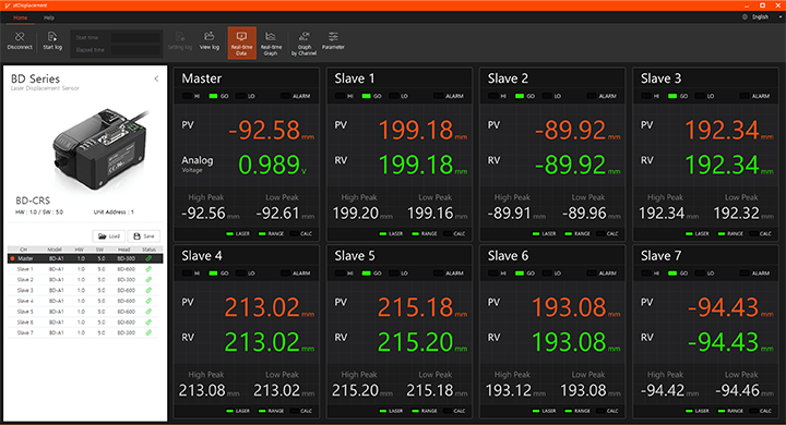 BD-C系列通信转换器用于BD系列激光位移传感器的RS232C/RS485通信。通过使用侧面连接器连接传感器放大器单元,可以为通信转换器供电。atDisplacement激光位移传感器软件允许用户在不连接主机设备的情况下批量处理参数设置,实时监视测量值和输出,设置通信速度和地址。