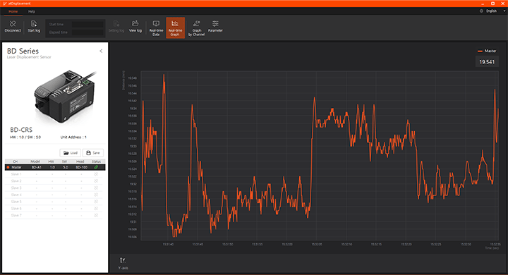 激光位移传感器的最大分辨率1㎛(BD-030),用于稳定和精确的测量。