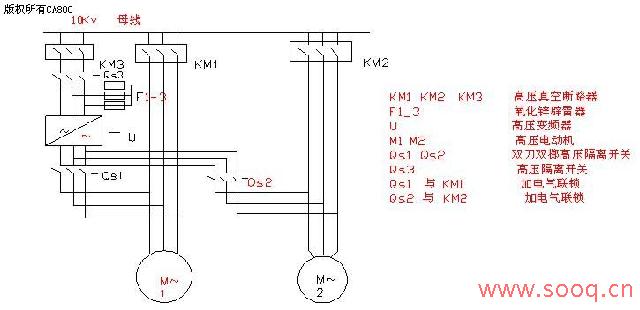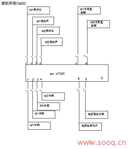 图1:变频器与现场设备接口图 其中:高压紧急分断信号与KM1高压开关控制跳闸回路并联,高压合闸允许信号与KM1高压开关控制合闸回路串联,M1、M2阀门开全,关严信号取自阀门行程开关的空节点。M1、M2阀门开阀,关阀信号与阀门开阀,关阀控制回的开关阀按钮并联。M1、M2,水泵重故障信号取自水泵控制保护柜的空节点。