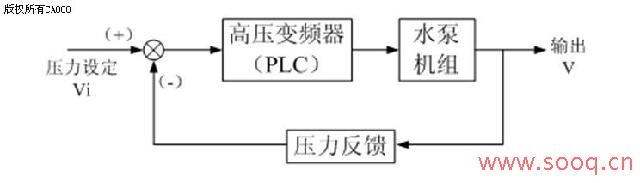 图2:变频器与现场设备一次接线图 四、 恒压供水系统原理及PID调整 由于苍南平原引供水公司泵站是新改建工程,用水负荷需要在实际运行时进行精确调整和测量,因此采用的是恒压供水系统,其工作原理如图3所示,测量元件为压力传感器,将它设在水泵机组出水口,Vi为恒定供水压力设定值,供水压力V作为输出量,构成闭环控制系统。变频器内部的PLC采集供水压力值V与用户给定值Vi进行比较和运算,通过PID进行调整,将结果转换为频率调节信号送至变频器,直至达到供水压力的给定值Vi。不管系统供水流量如何变化,供水压力值V始终维持在给定压力值Vi附近。
