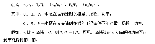 苍南平原地区的各乡镇的用水量是不均匀的,这是由于气候和人们生活以及生产规律所决定的。由于流量的变化从而影响到管网水头损失的变化,尤其是地势平坦的地区,在几何扬程很小的情况下,送水泵站出口所需压力随流量的变化更为显著。水泵站的装机是按最不利条件下、最大时流量和所需相应扬程决定的。而实际上每天内只有很短时间能达到最大时流量,大多数时间里,水泵站都处在小流量下工作。为了适应流量的变化,先前泵站在运行中多采取关小出口闸门的办法来控制流量,从而造成出口闸门前后的压力差值(少则多米,多则几十米)就白白地浪费于闸门阻力上。当水泵台数足够多时,是可以很好地适应水量变化的,但是水泵型号是有限的。装机台数过多,不仅管理不便,而且会无谓地增大建筑面积,提高工程造价,即使这样,也无法做到完全适应水量变化,还需要用闸门来调节水量。为此,采用水泵机组高压变频调速技术,可连续地改变水泵转数,来变更水泵工况,使其流量与扬程适应于管网用水量的变化,从而提高机组效率,维持管网压力恒定,达到节能的效果。我们从水泵调节原理得知,当水泵拖动电机工频运行时,出力为额定值,转速及功率亦为额定值;当采用变频调速时,可以按需要升降电机转速,改变水泵的性能曲线,使水泵的额定参数满足工艺要求。根据水泵的相似定律,变速前后流量、扬程、功率与转速之间的关系为: