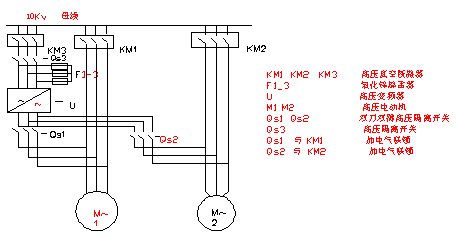 其中:高压紧急分断信号与KM1高压开关控制跳闸回路并联,高压合闸允许信号与KM1高压开关控制合闸回路串联,M1、M2阀门开全,关严信号取自阀门行程开关的空节点。M1、M2阀门开阀,关阀信号与阀门开阀,关阀控制回的开关阀按钮并联。M1、M2,水泵重故障信号取自水泵控制保护柜的空节点。