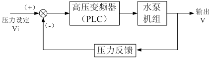 由于苍南平原引供水公司泵站是新改建工程,用水负荷需要在实际运行时进行精确调整和测量,因此采用的是恒压供水系统,其工作原理如图3所示,测量元件为压力传感器,将它设在水泵机组出水口,Vi为恒定供水压力设定值,供水压力V作为输出量,构成闭环控制系统。变频器内部的PLC采集供水压力值V与用户给定值Vi进行比较和运算,通过PID进行调整,将结果转换为频率调节信号送至变频器,直至达到供水压力的给定值Vi。不管系统供水流量如何变化,供水压力值V始终维持在给定压力值Vi附近。
