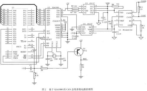 主控制器笔者采用AT89C51 单片机作为处理核心, 采用PCA82C250 作为CAN 总线收发器, 图2 给出了基于 SJA1000的CAN 总线系统电路图。为了增强抗干扰能力, SJA1000 的TX0 和RX0 引脚并没有直接和PCA82C250 的 TXD, RXD 相连接, 而是通过高速光耦6N137 后与PCA82C250 相连, 这样可以实现总线上各CAN 节点之间的电气隔离, 光耦 6N137 的两侧使用完全独立的两组电源VCC 和+5V。