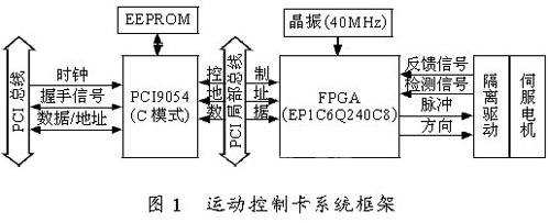 本文所述的运动控制卡是PCI(peripheral component interconnect)接口卡[1],用Altera 公司生产的型号为 EP1C6Q240C8的FPGA 作为编程逻辑器件,实现所有的硬件算法和反馈信号的检测。采用脉冲加方向[2]的闭环控制方式对电机进行控制。整个运动控制卡系统可用图1 描述。