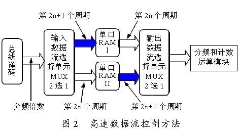 运动控制卡硬件电路描述和设计时,严格按照同步时序设计原则[3],而且核心电路用D 触发器实现,电路的主要信号由时钟的上升沿触发器产生。这样可以很好地避免毛刺,并且在布局后仿真和用高速逻辑分析仪采样实际工作信号皆无毛刺。在高速变化的分频倍数数据流控制时,为了保证整个系统的分频输出的实时性,采用如图2 所示的“乒乓操作[3]”技巧。在奇数(2n+1)个缓冲周期时,输入的数据流缓冲到RAMⅠ和从RAMⅡ取出数据到运算模块。在第偶数(2n)个缓冲周期,将数据流缓冲到RAMⅡ,将RAM1 里的数据通过“数据输出选择单元”的选择,送到最后的分频和计数的运算模块进行计算输出。如此循环,周而复始。这种流水线式算法,可以完成数据的无缝缓冲与处理。