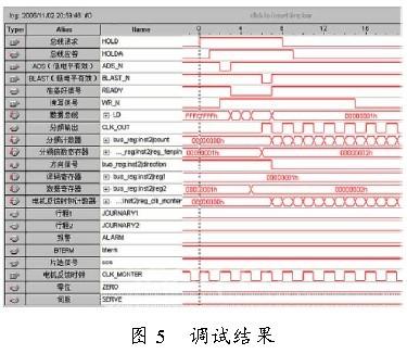从图5 的调试结果来看,运动控制卡的整个控制服从于总线仲裁逻辑。PCI 和FPGA 数据交换在READY=0 时进行,总线LD 上数据在READY=0 时有效。分频倍数寄存器值改变,分频输出频率即刻作相应改变,满足设计目标。对电机行程(journey1和journey2)、报警(alarm)、零位(zero)和伺服(servo)等外部信号的检测和判断。对反馈回来的时钟进行检测计数。由于PCI 和FPGA 交换数据均发生在系统时钟的上升沿。所以在数据交换过程中,必然会存在一个小于1 个时钟周期的延迟误差。