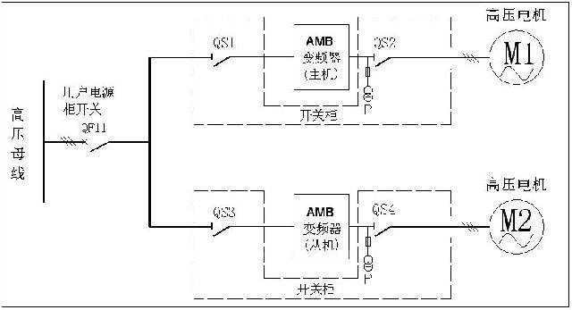 注意:a. QS1、QS2为主机开关柜高压隔离开关,控制M1电机运行; QS3、QS4为从机开关柜高压隔离开关控制M2电机运行。