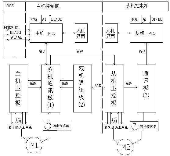 由中控室系统操作员通过DCS与双机同步变频器主机PLC通讯,传送转速运行需要的给定频率、启动、停止等信息操作主机;双机同步主机接收到信息后,实时对从机发出相应的给定频率或控制信号,从机反馈信息,并响应和执行主机的命令;