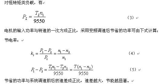 据统计,全世界的用电量中约有60%是通过电动机来消耗的。由于考虑起动、过载、安全系统等原因,高效的电动机经常在低效状态下运行,采用变频器对交流异步电动机进行调速控制,可使电动机重新回到高效的运行状态,这样可节省大量的电能。生产机械中电动机的负载种类千差万别,为便于分析研究,将负载分为平方转矩﹑恒转矩和恒功率等几类机械特性,本文仅对平方转矩﹑恒转矩负载的节能进行估算。所谓估算,即在变频器投运前,对使用了变频器后的节能效果进行的计算预测。变频器一旦投运后,用电工仪表测量系统的节能量更为准确。现假定,电动机系统在使用变频器调速前后的功率因数基本相同,且变频器的效率为95%。