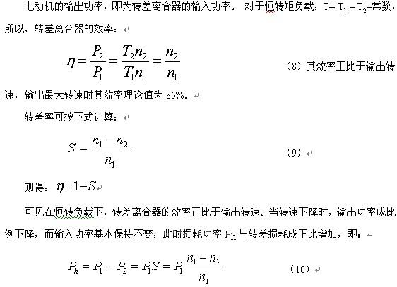 电磁调速系统由鼠笼异步电机、转差离合器、测速电机和控制装置组成,通过改变转差离合器的激磁电流来实现调速。转差离合器的本身的损耗是由主动部分的风阻、磨擦损耗及从动部分的机械磨擦损所产生的。如果考虑这些损耗与转差离合器的激磁功率相平衡,且忽略不计的话,转差离合器的输入、输出功率可由下式计算: