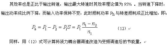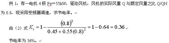 GB12668定义变频器为转换电能并能改变频率的电能转换装置。能量转换过程中必然伴随着损耗。在变频器内部,逆变器功率器件的开关损耗最大,其余是电子元器件的热损耗和风机损耗,变频器的效率一般为95%-96%,因此在计算变频调速节能时要将变频器的4%-5%的损耗考虑在内。如考虑了变频器的损耗本文例1中计算的节能率,就不是36%,而应该为31%-32%,这样的计算结果与实际节能率更为接近。