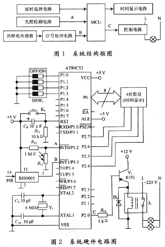系统结构图如图1所示。本系统主要由光照检测电路、热释电红外线传感器及处理电路、单片机系统及控制电路组成。工作时,光照检测电路和热释电红外线传感器采集光照强弱、室人是否有人等信息送到单片机,单片机根据这些信息通过控制电路对照明设备进行开关操作,从而实现照明控制,以达到节能的目的。