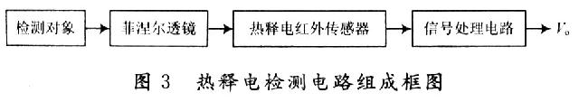 热释电红外传感器能以非接触形式检测出人体辐射的红外线,并将其转变为电压信号。热释电传感器具有成本低、不需要用红外线或电磁波等发射源、灵敏度高、可流动安装等特点。实际使用时,在热释电传感器前需安装菲涅尔透镜,这样可大大提高接收灵敏度,增加检测距离及范围。实验证明,热释电红外传感器若不加菲涅尔透镜,则其检测距离仅为2 m左右;而配上菲涅尔透镜后,其检测距离可增加到10 m以上。由于热释电传感器输出的信号变化缓慢、幅值小(小于1 mV),不能直接作为照明系统的控制信号,因此传感器的输出信号必须经过一个专门的信号处理电路,使得传感器输出信号的不规则波形转变成适合于单片机处理的数字信号。根据以上要求,人体热释电检测电路组成框图如图3所示。
